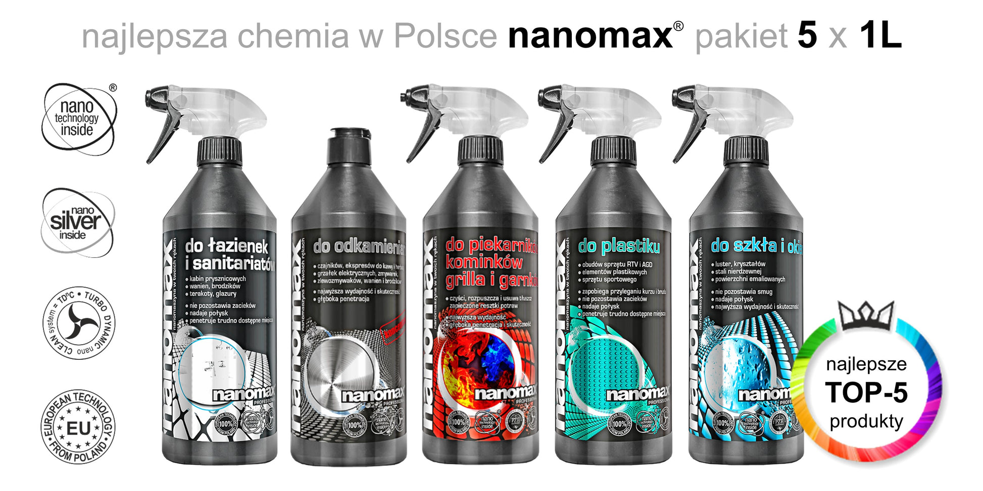 Zestaw nanomax® TOP 5 to pełna linia profesjonalnych środków czystości, które razem ogarną wszystko — od kuchni i łazienki po kominek i okna.